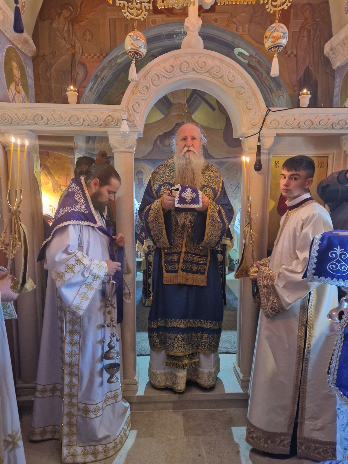 – Наша света вера има небеско порекло, али благодарећи Оваплоћењу Христовом, она је толико нама блиска да је по свему остала људска. Односно, све оно што је Божанско, Бог је преко Сина Свога, а можемо рећи на неки начин и преко Пресвете Богородице, саопштио и даровао нама, тако да смо се обогатили небеским богатством, небеском лепотом. Како је свима нама пријатно гледати ово плаветнило данашње – оно, наравно, само указује на лепоту духовног Неба и Царства Божијег, које је испуњено Божанским милинама, Божанском мудрошћу, лепотом, правдом, истином и љубављу. И ми све то имамо у овим светим службама које вршимо, нарочито за празнике као што је данашњи празник Пресвете Деве Богородице. Постајемо причасници Царства небеског кроз Свете Тајне Христове. Постајемо причасници Божије истине, правде, љубави, милости и доброте, и то постаје садржај – то што је божанско, небеско, постаје садржај нашег живота. Човек има ту пријемчивост да прими духовно богатство, да се стално обогаћује, да се стално просвећује и да се сједињује са Богом. Има способност, ако чистог срца служи Господу, да смести Бога Живога у срце своје, у мисли своје, у дела своја.