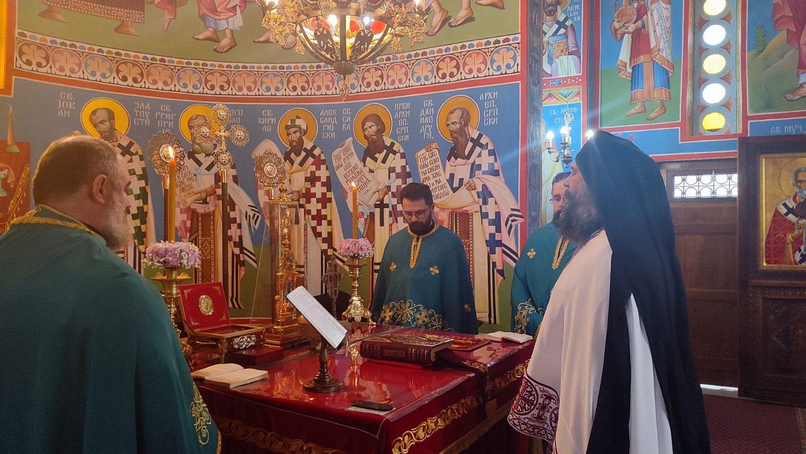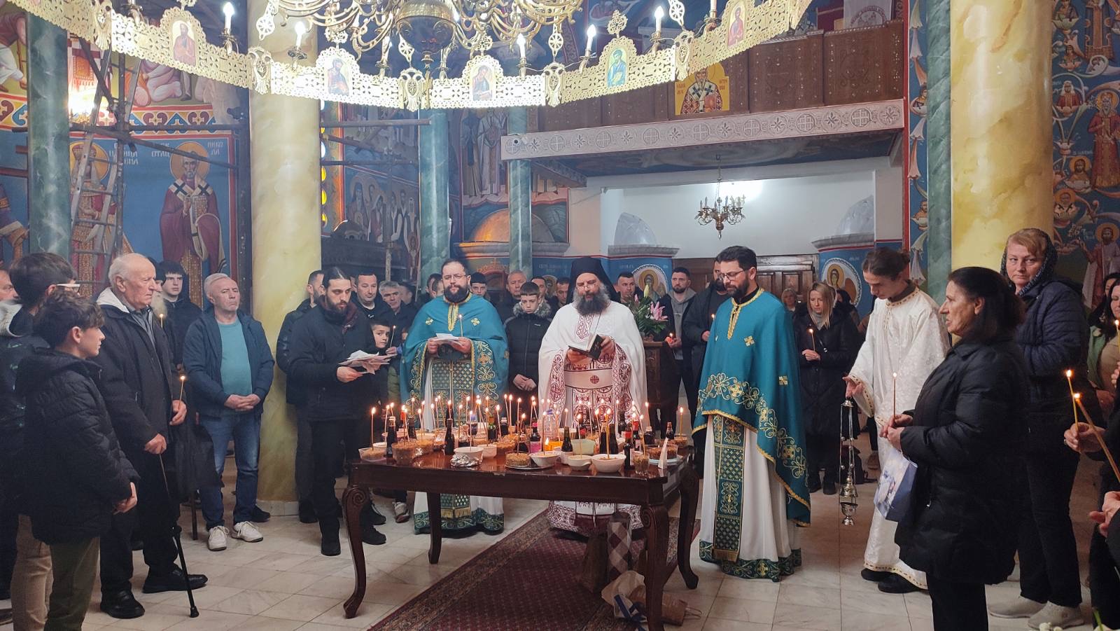 Архимандриту Андреју саслуживали су свештеници храма Св. Василија, уз молитвено присуство великог броја верника који су се сабрали да прославе Светог Трифуна и упуте молитве за своје упокојене.